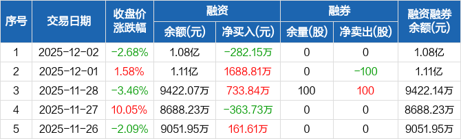 宏柏新材:融资净偿还282.15万元,融资余额1.08亿元(12-02)
