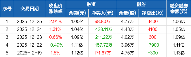 宏柏新材:融资净买入98.8万元,融资余额1.05亿元(12-25)