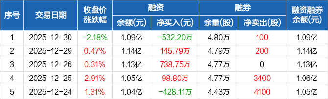 宏柏新材:融资净偿还532.2万元,融资余额1.09亿元(12-30)
