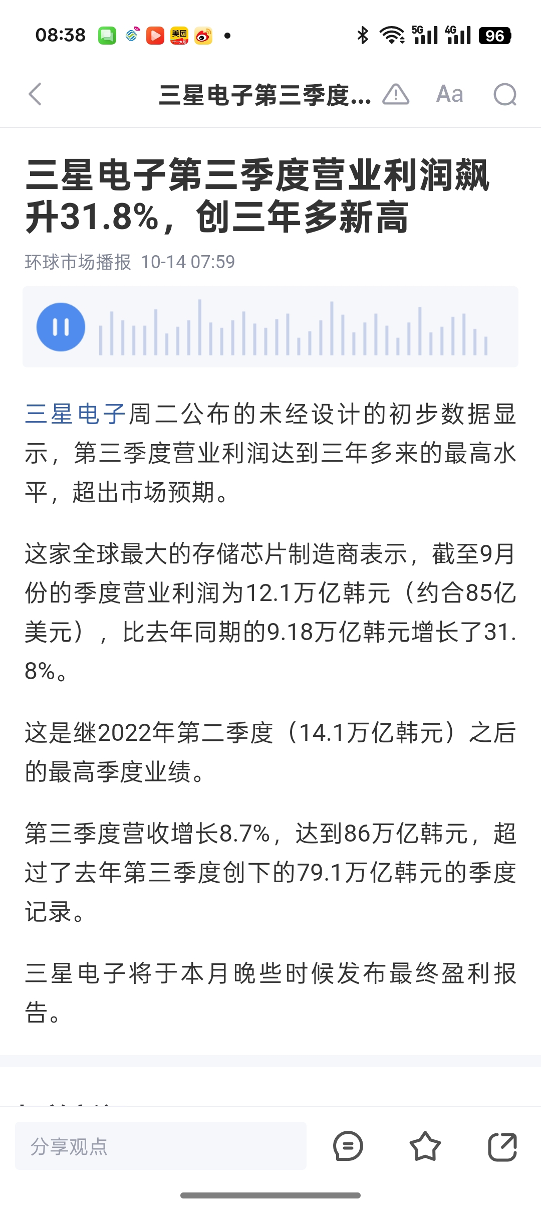 三星电子公布三季报业绩: