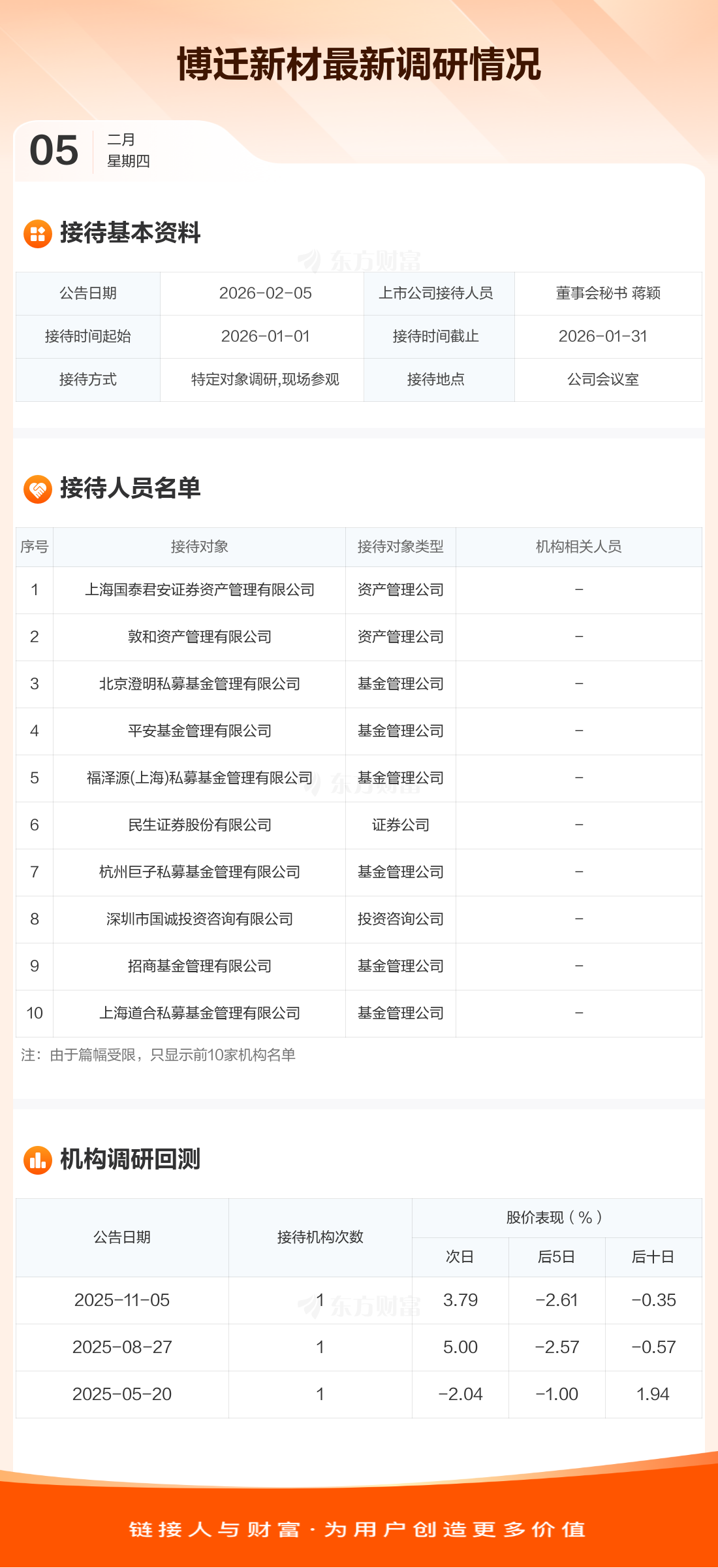 博迁新材2月5日公告称,1月1日至1月31日接待上海国泰君安证券资产管理有限公司等26家机构调研。接待人员包括董事会秘书 蒋颖。