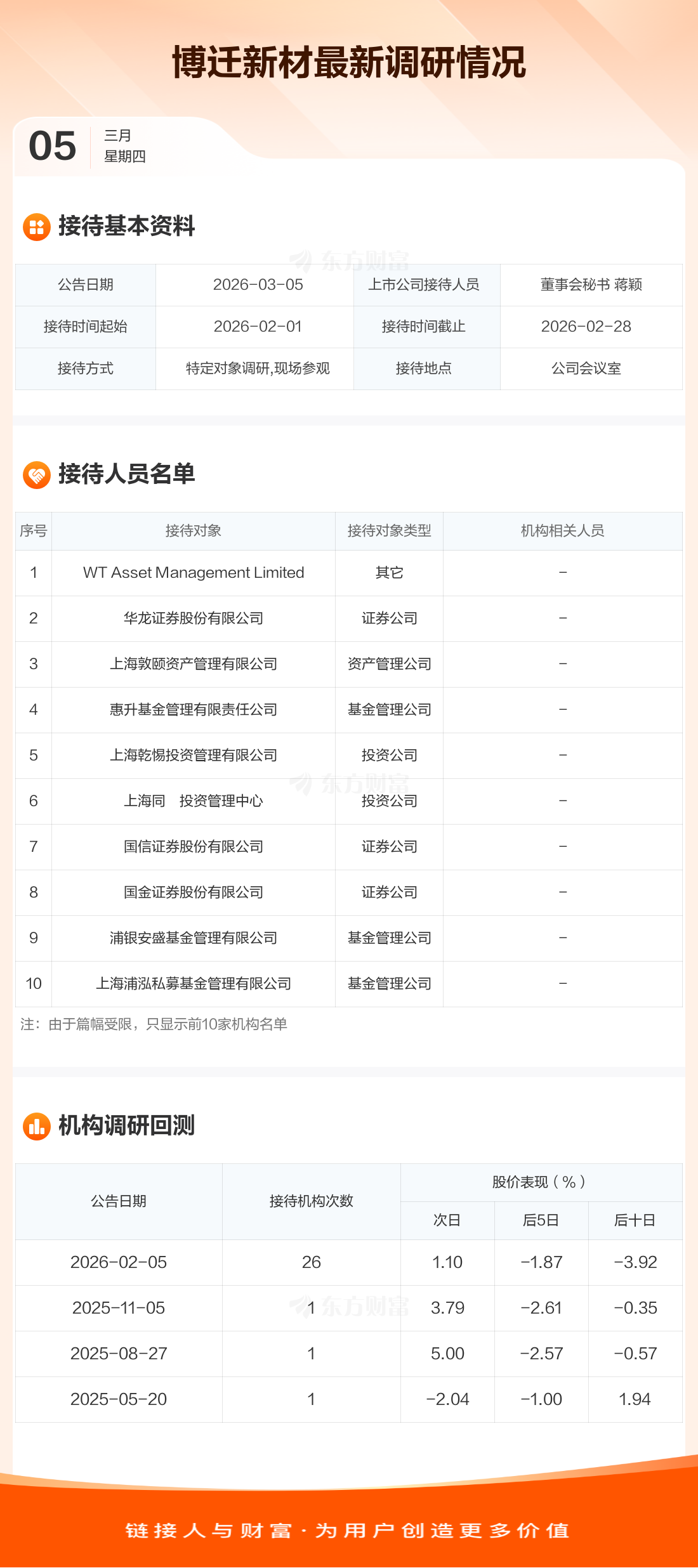 博迁新材3月5日公告称,2月1日至2月28日接待WT Asset Management Limited等31家机构调研。接待人员包括董事会秘书 蒋颖。