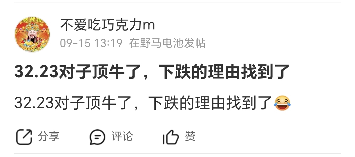 $野马电池(SH605378)$ 距离这个已经一个多月了,对子顶不愧是对子顶,到现在还一蹶不振