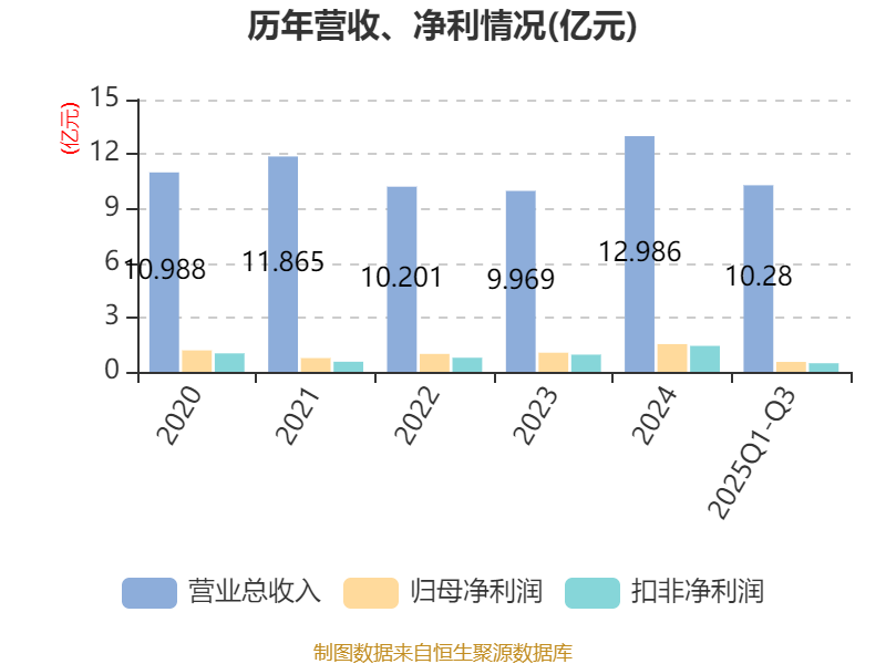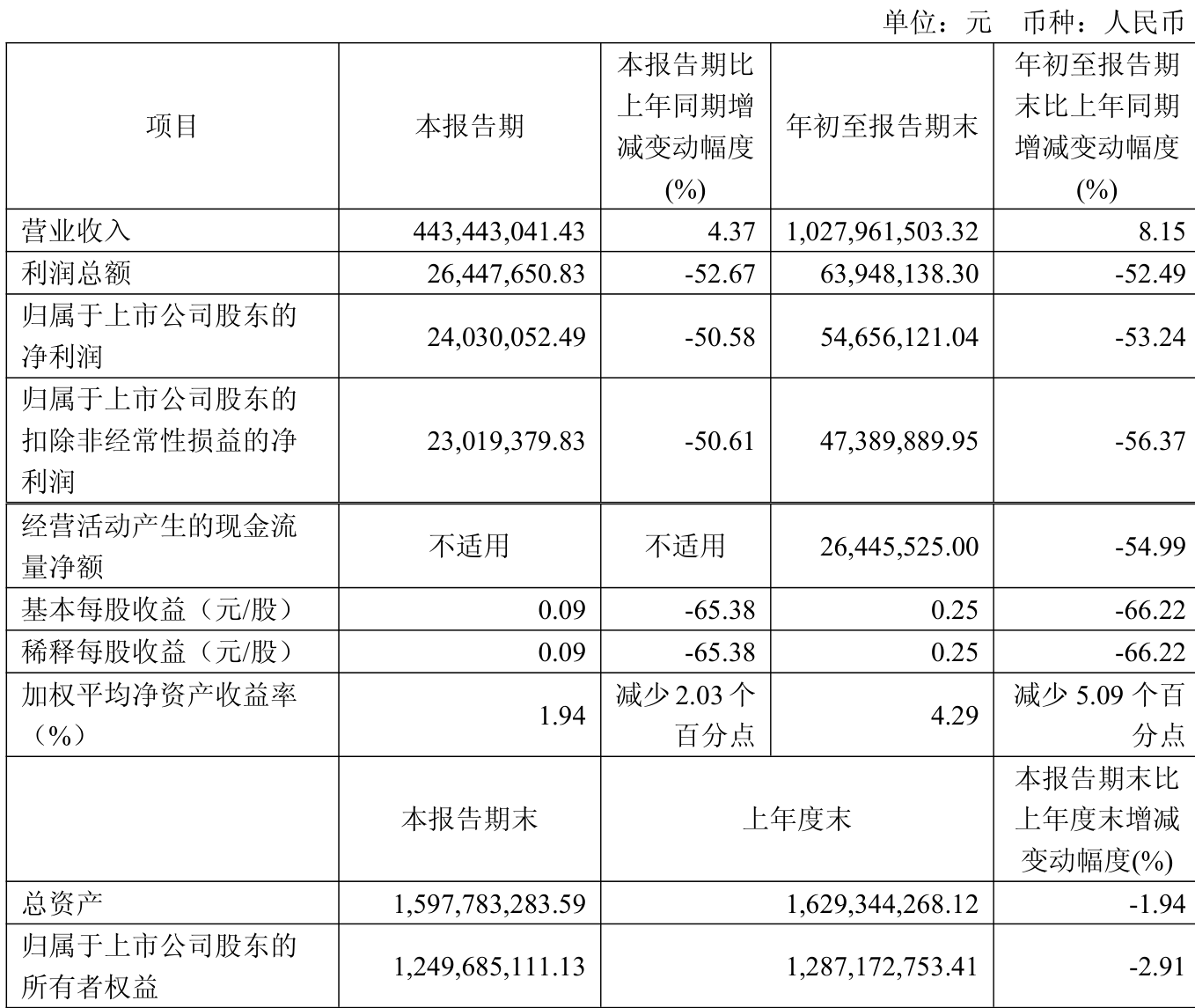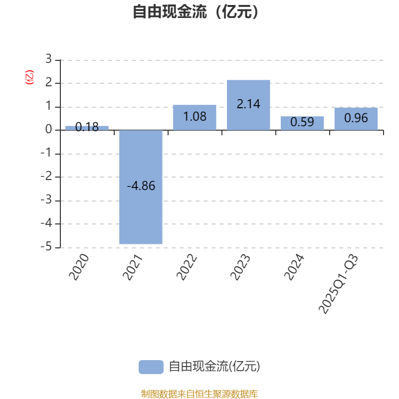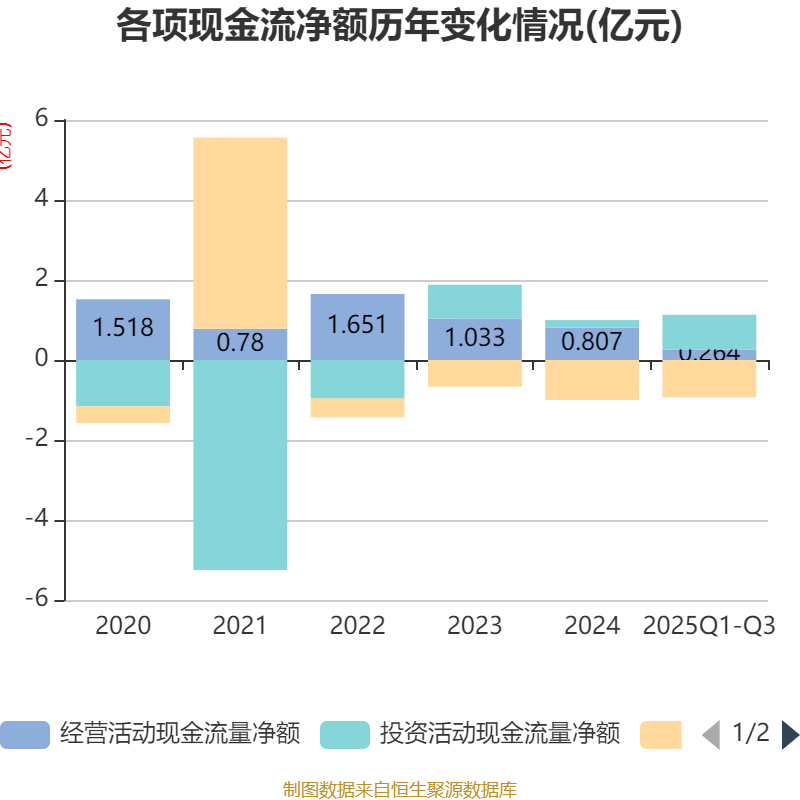2025年前三季度,公司经营活动现金流净额为2644.55万元,同比下降54.99%;筹资活动现金流净额-9339.31万元,同比增加666.82万元;投资活动现金流净额8668.71万元,上年同期为8763.5万元。