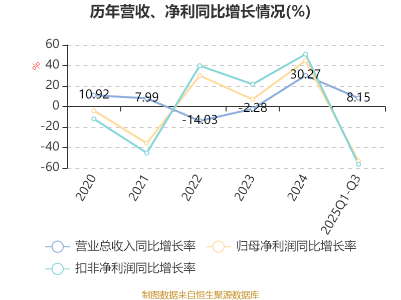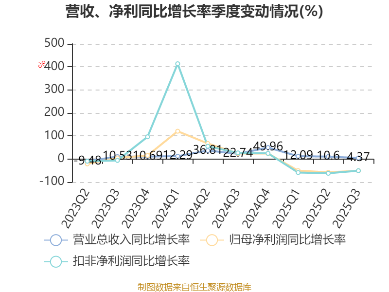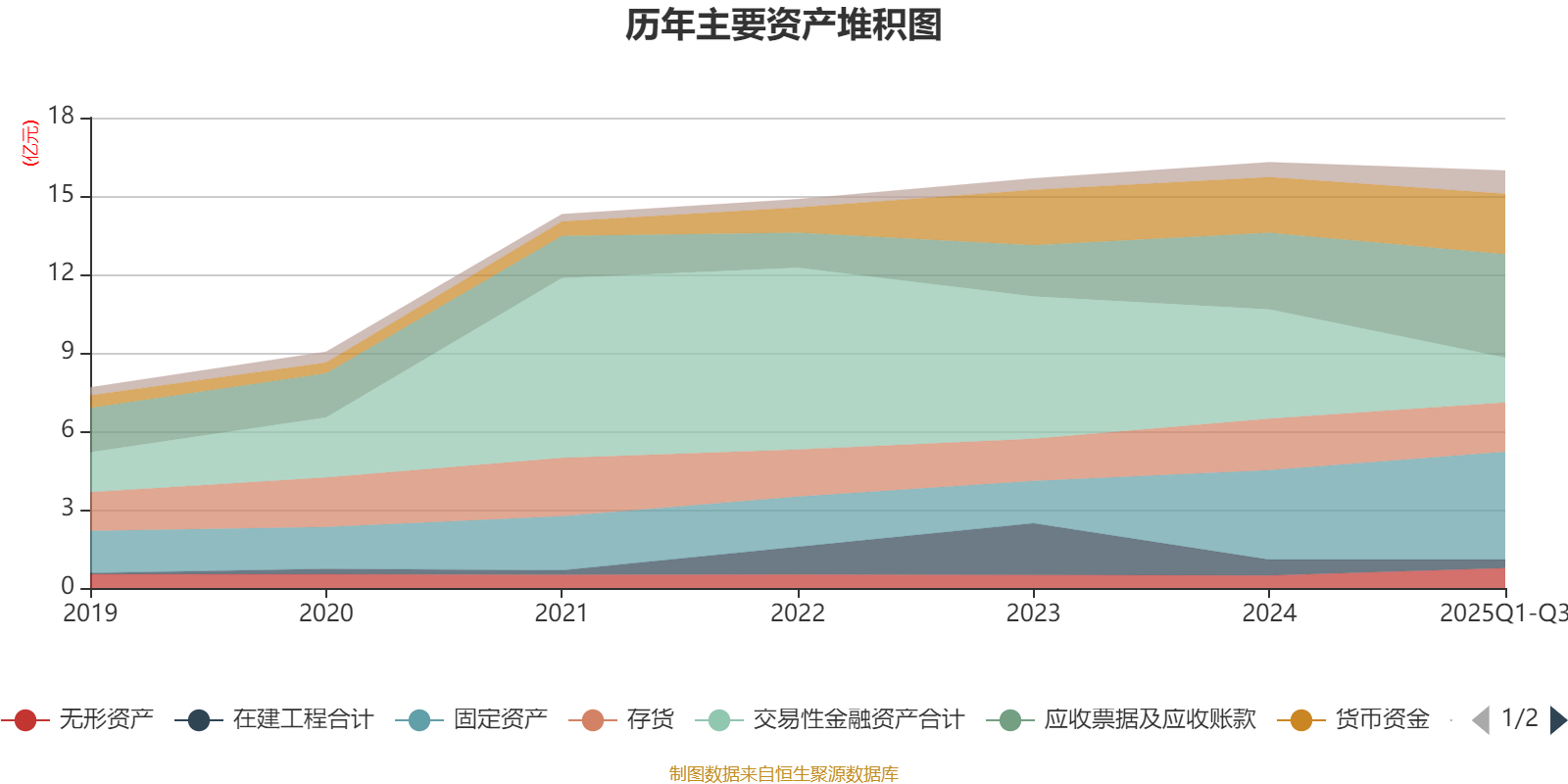 资产重大变化方面,截至2025年三季度末,公司交易性金融资产合计较上年末减少59.09%,占公司总资产比重下降14.95个百分点;应收票据及应收账款较上年末增加34.84%,占公司总资产比重上升6.75个百分点;固定资产较上年末增加20.38%,占公司总资产比重上升4.79个百分点;其他非流动金融资产较上年末增加196.36%,占公司总资产比重上升2.48个百分点。