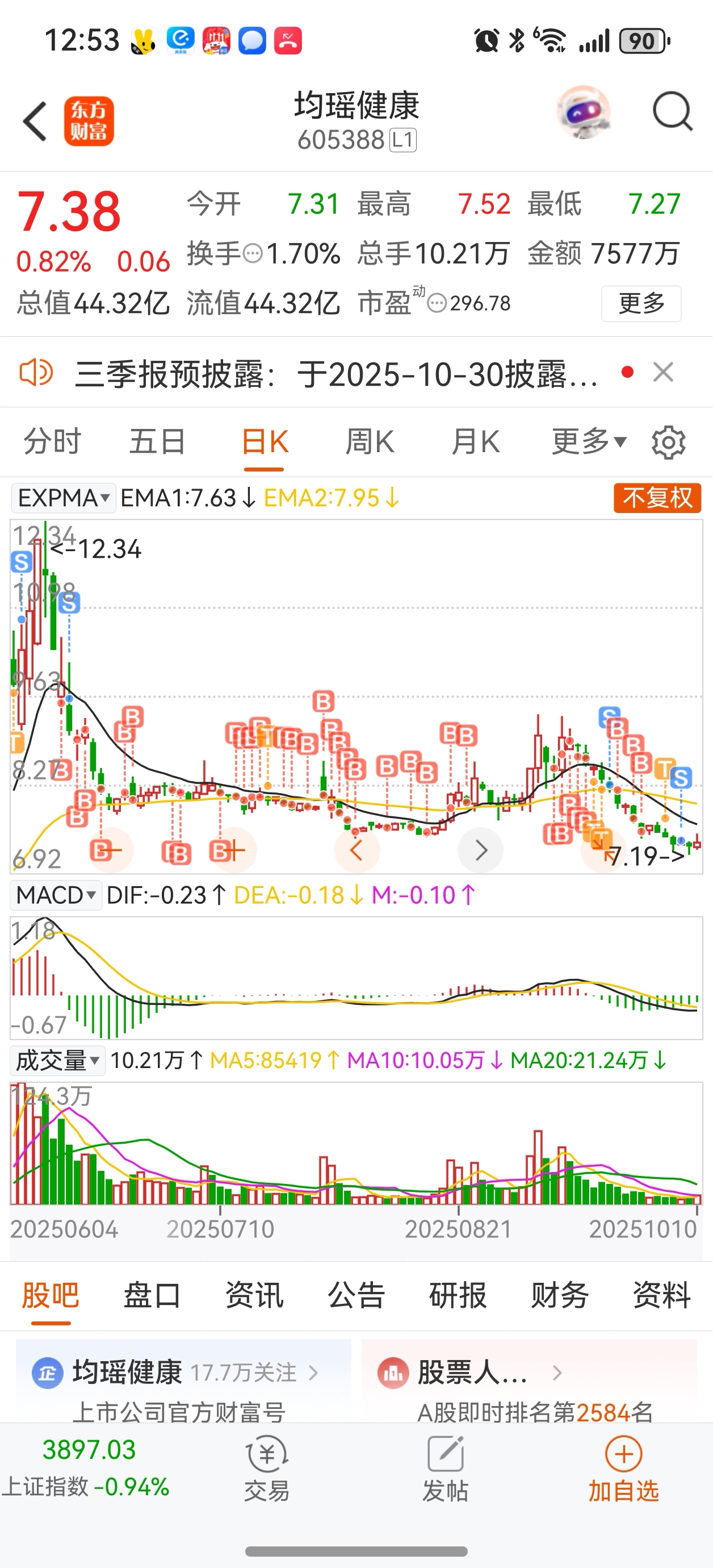 $均瑶健康(SH605388)$ 给老子套的死死的