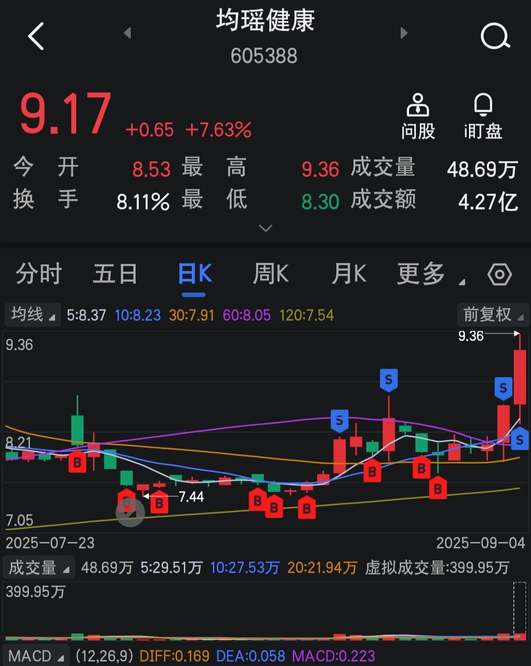 $均瑶健康(SH605388)$ 9月4日全清了,虽然赚了一点,回过头一看,还是心惊胆战,逃顶和控制回撤远比抄底难。