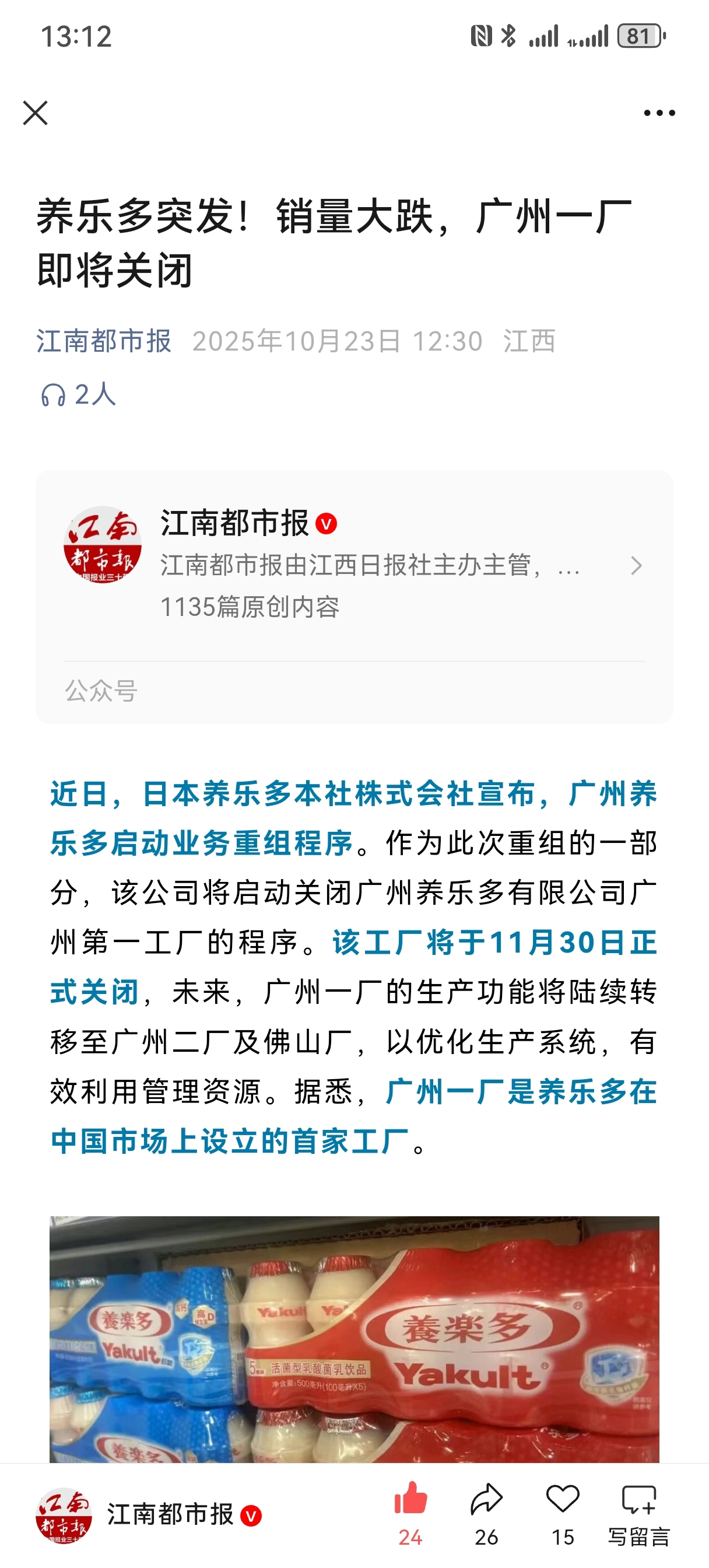 $均瑶健康(SH605388)$ 养乐多销量大跌,广州一厂关闭。