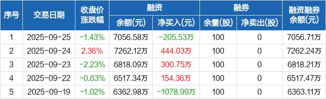 晨光新材:融资净偿还205.53万元,融资余额7056.58万元(09-25)