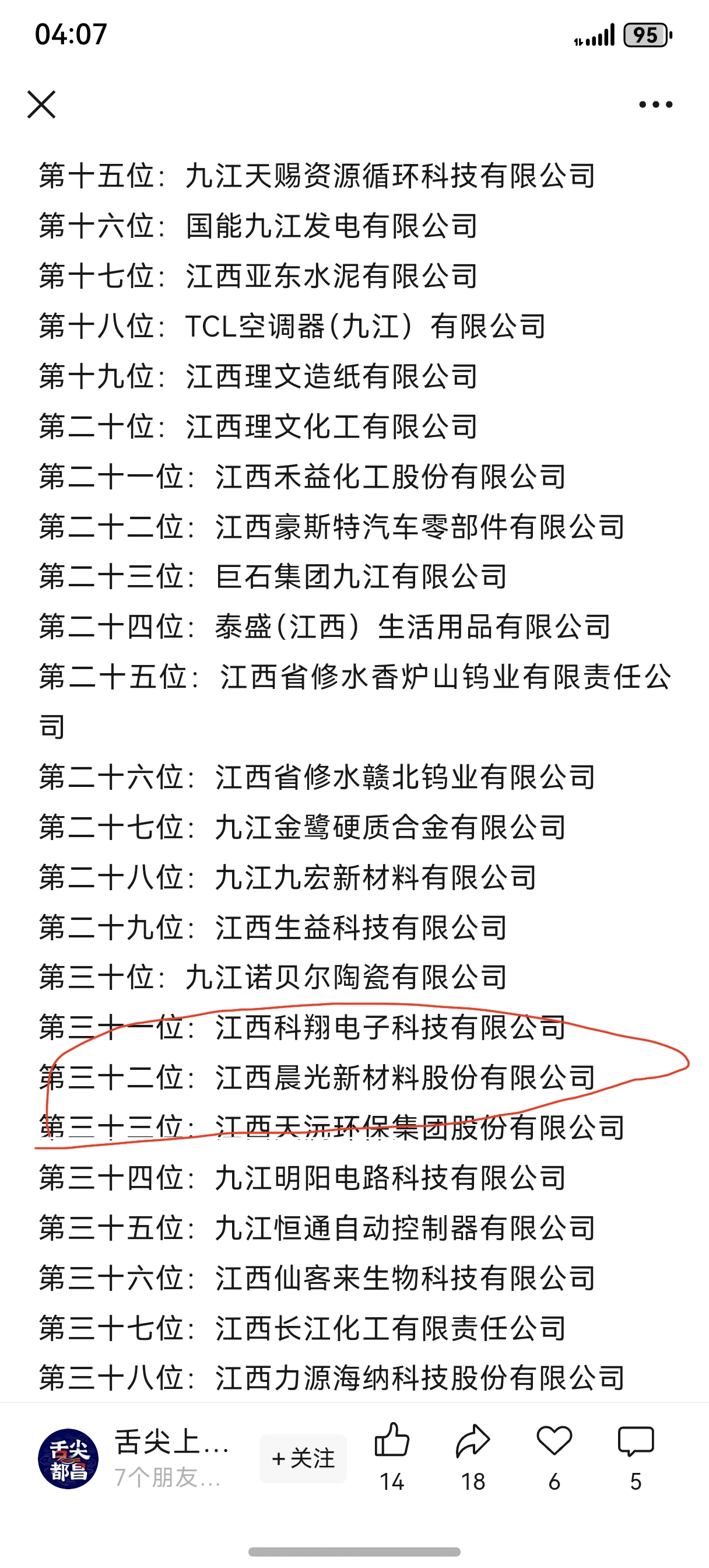 $晨光新材(SH605399)$ 九江市企业排行榜