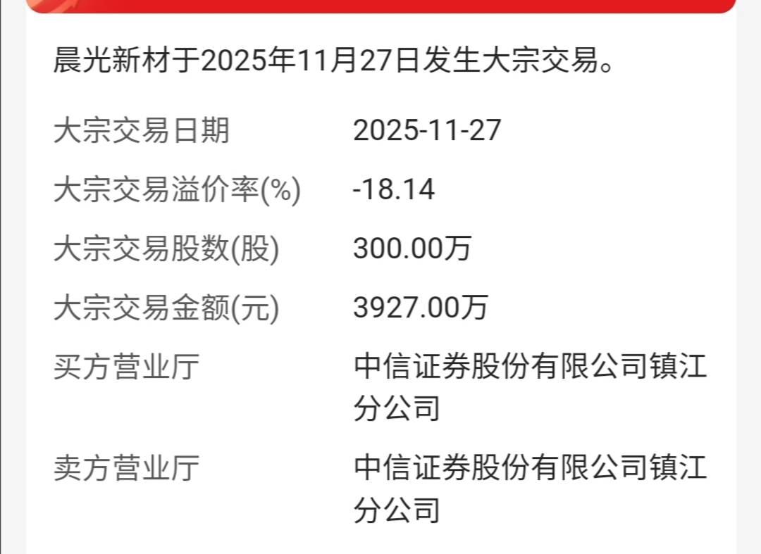 $晨光新材(SH605399)$ 11月27号收盘价15.99元封涨停板,成交价13.09元的大宗交易是什么鬼?事出反常啊!