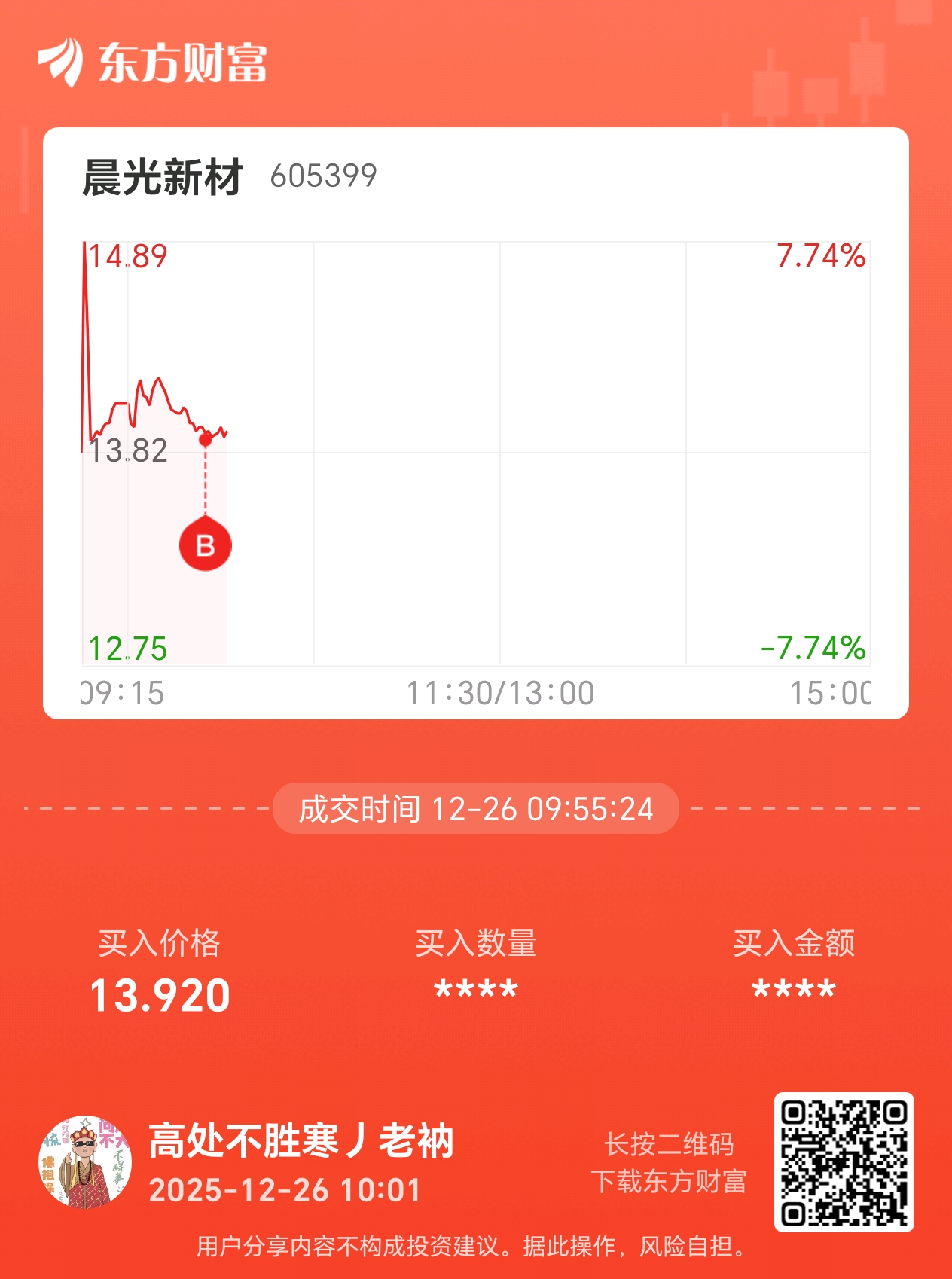 $晨光新材(SH605399)$ 我又来了,今日出手早了