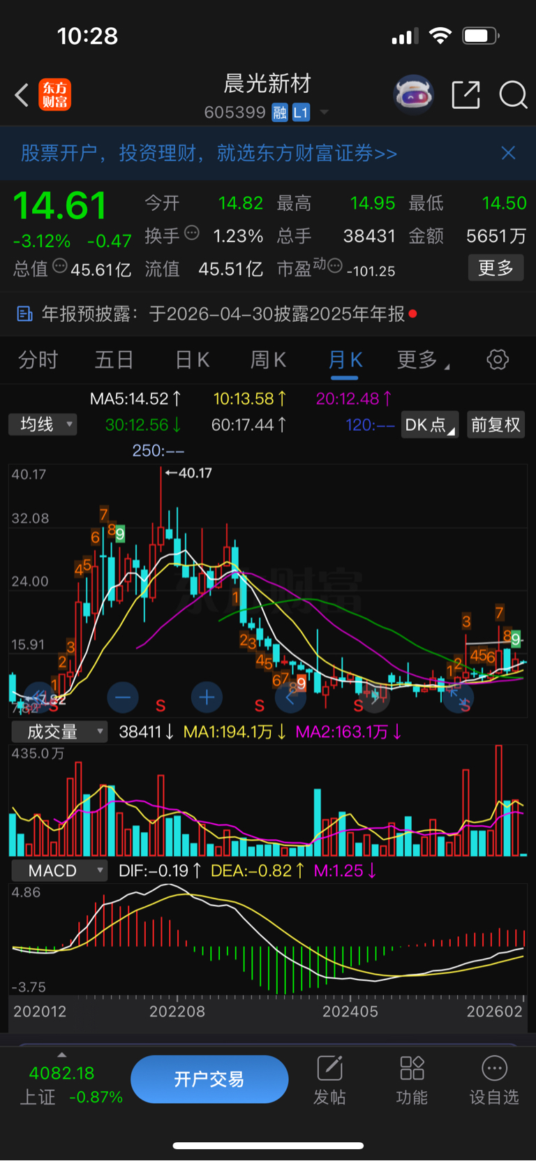 $晨光新材(SH605399)$ 这个月线大家看下,40多块下来这么么,还有一些旬托在配合唱空,大家好好拿着,那个专业不在,估计就拉,日线有可能做个W图,可能会破前低。