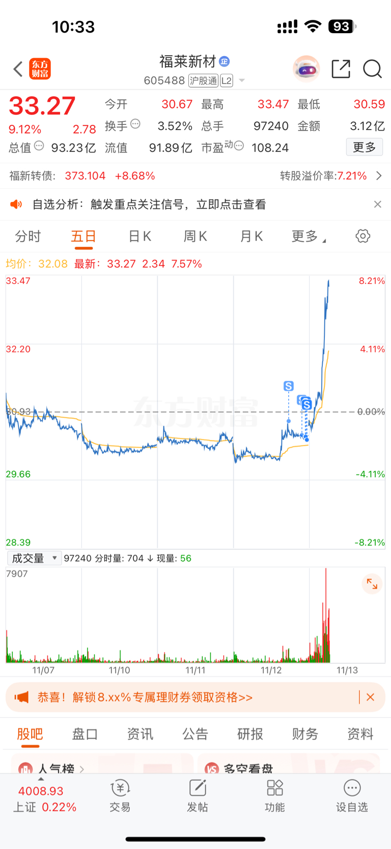 $福莱新材(SH605488)$ 赚钱的感谢我,昨天交出 15000 股带血筹码,主力才拉的!