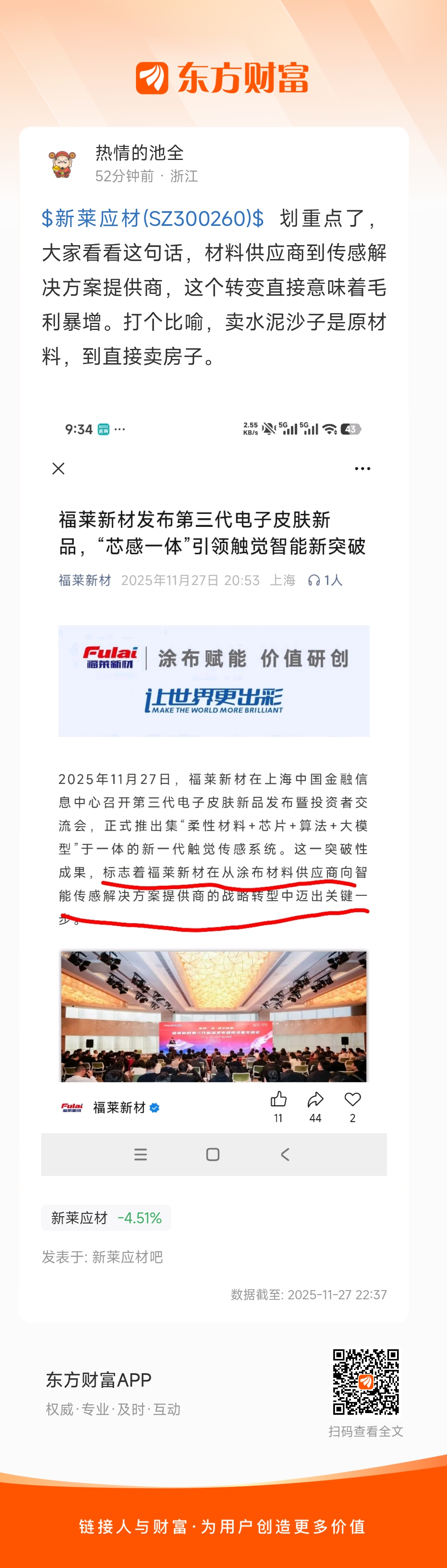 $新莱应材(SZ300260)$ $福莱新材(SH605488)$ 划重点了,大家看看这句话,材料供应商到传感解决方案提供商,这个转变直接意味着毛利暴增。打个比喻,卖水泥沙子是原材料,到直接卖房子。