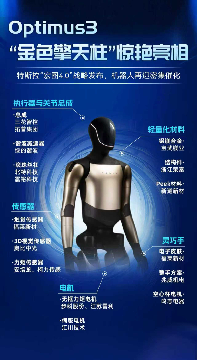 产业链价值集中于执行器、传感器、视觉系统等核心环节,其中执行器系统占成本35%为最高,传动、感知等细分领域技术壁垒高,国产供应商凭借成本优势与技术突破,成为特斯拉供应链核心力量,迎来业绩爆发期。