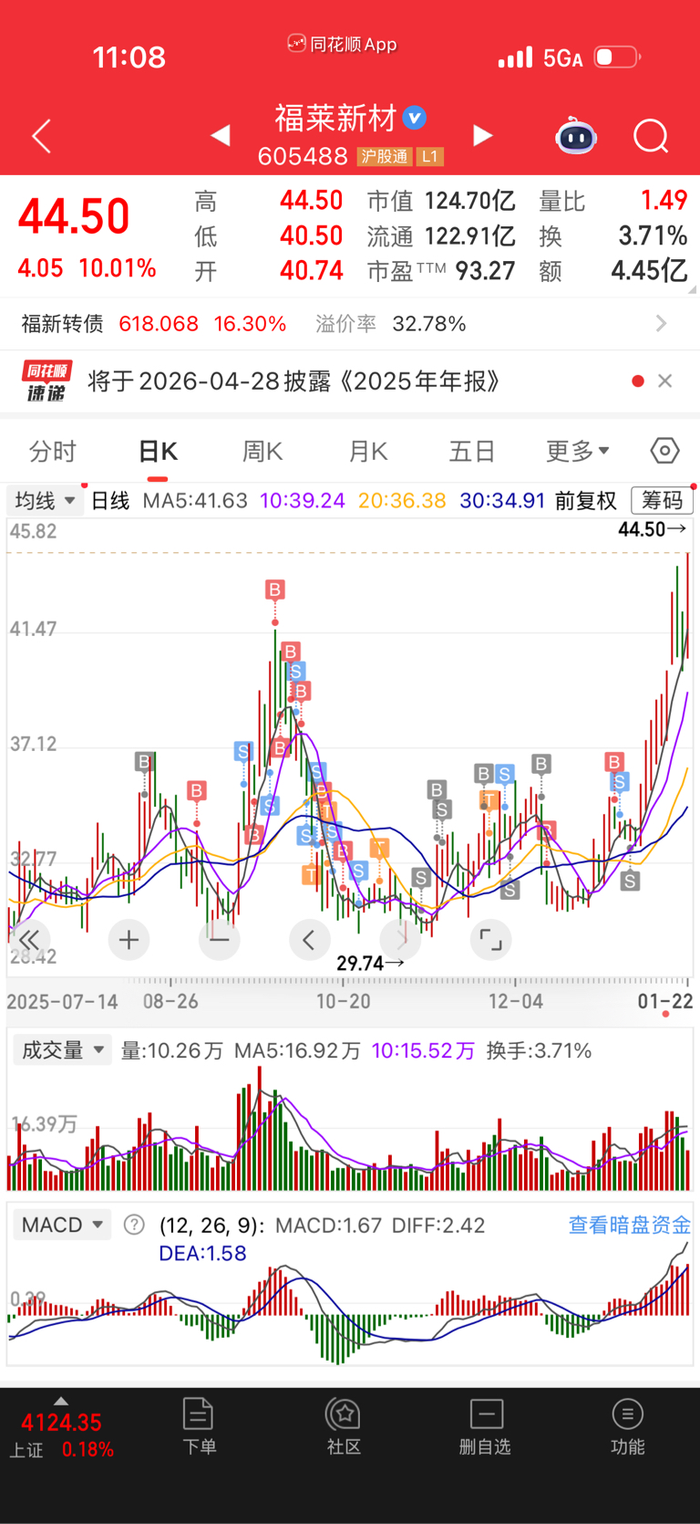 $福莱新材(SH605488)$ 跌的时候吃净达奋,涨的时候就没我啥事了