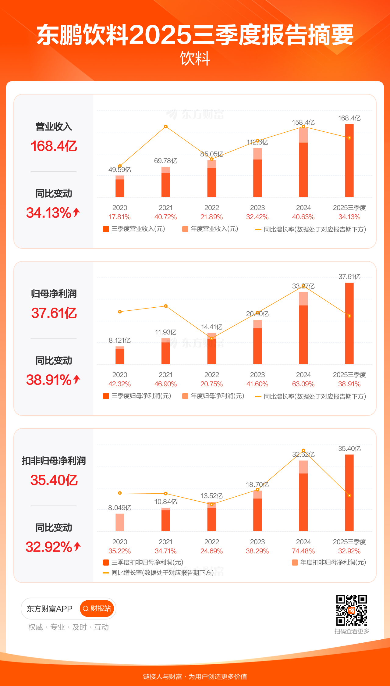 东鹏饮料10月25日发布2025年三季报显示,公司前三季实现营业收入168.44亿元,同比增长34.13%;归母净利润37.61亿元,同比增长38.91%;扣非归母净利润35.40亿元,同比增长32.92%。