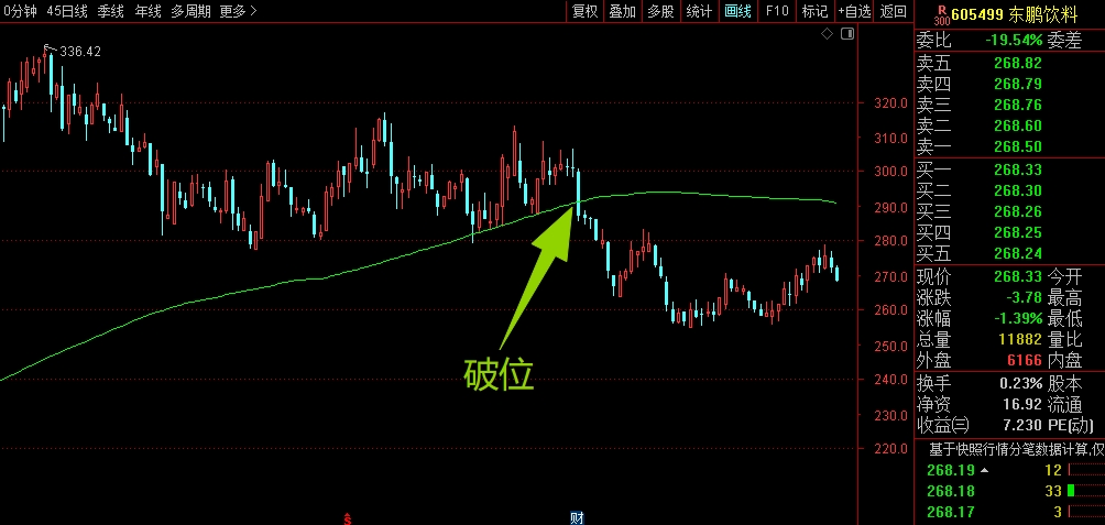 $东鹏饮料(SH605499)$ 中期走势偏弱了,主要是前面高位回落下来,跌破了大均线的支撑,没有能马上拉回去站稳,形成了破位趋势,这时候就要大幅减仓应对了,不然连续回落下来,就比较被动。目前来看整体趋势还是向下,暂时不考虑,同时也不要加仓。等站稳后再考虑。#炒股日记#