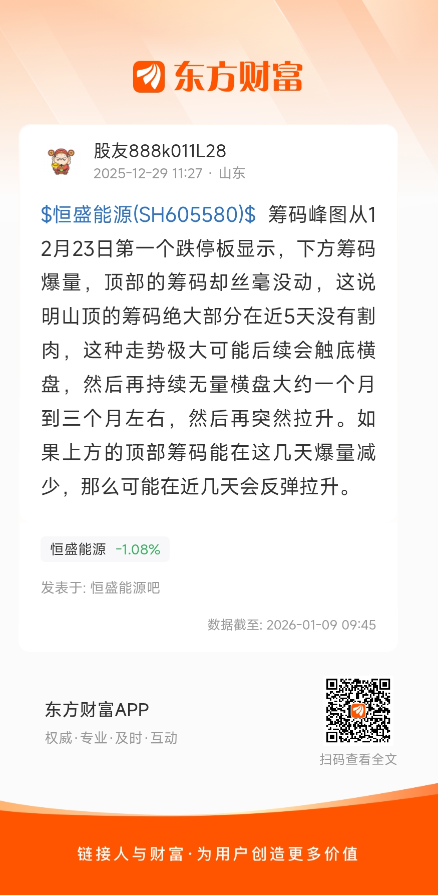 $恒盛能源(SH605580)$ 筹码峰图从12月23日第一个跌停板显示,下方筹码爆量,顶部的筹码却丝毫没动,这说明山顶的筹码绝大部分在近5天没有割肉,这种走势极大可能后续会触底横盘,然后再持续无量横盘大约一个月到三个月左右,然后再突然拉升。如果上方的顶部筹码能在这几天爆量减少,那么可能在近几天会反弹拉升。