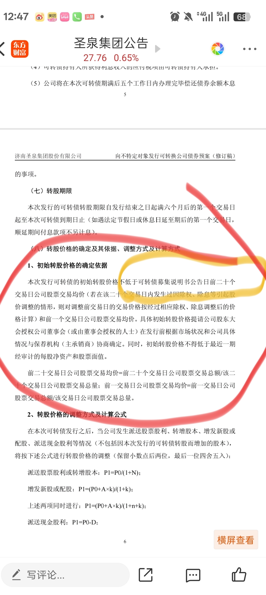 $圣泉集团(SH605589)$ 看了一下公告,意思就是可转债募集说明书公告日前二十天的交易均价作为可转债转股价格。意思就是,大家忍耐20天就好了