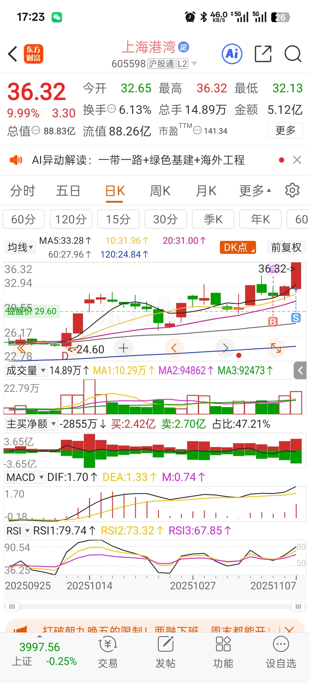 $上海港湾(SH605598)$ #炒股日记# #实盘记录# 再次卖飞的一只股票,记录一下,太菜还得练
