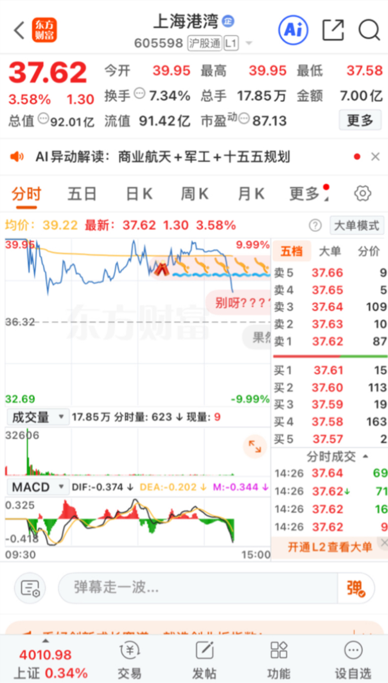 $上海港湾(SH605598)$ 尾巴大跳水,明天补缺36