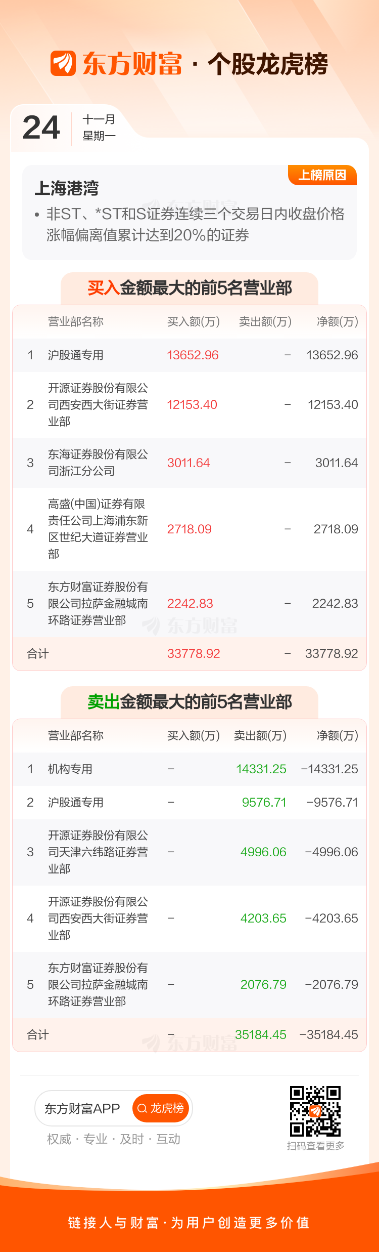 交易所2025年11月24日公布的交易公开信息显示,上海港湾因成为非ST、*ST和S证券连续三个交易日内收盘价格涨幅偏离值累计达到20%的证券上榜。上海港湾当日收报47.84元,涨跌幅10.00%,换手率5.17%,成交额5.79亿。异常期间11月20日至11月24日,期间涨幅19.78%,累计偏离值22.57%,区间成交额21.60亿。