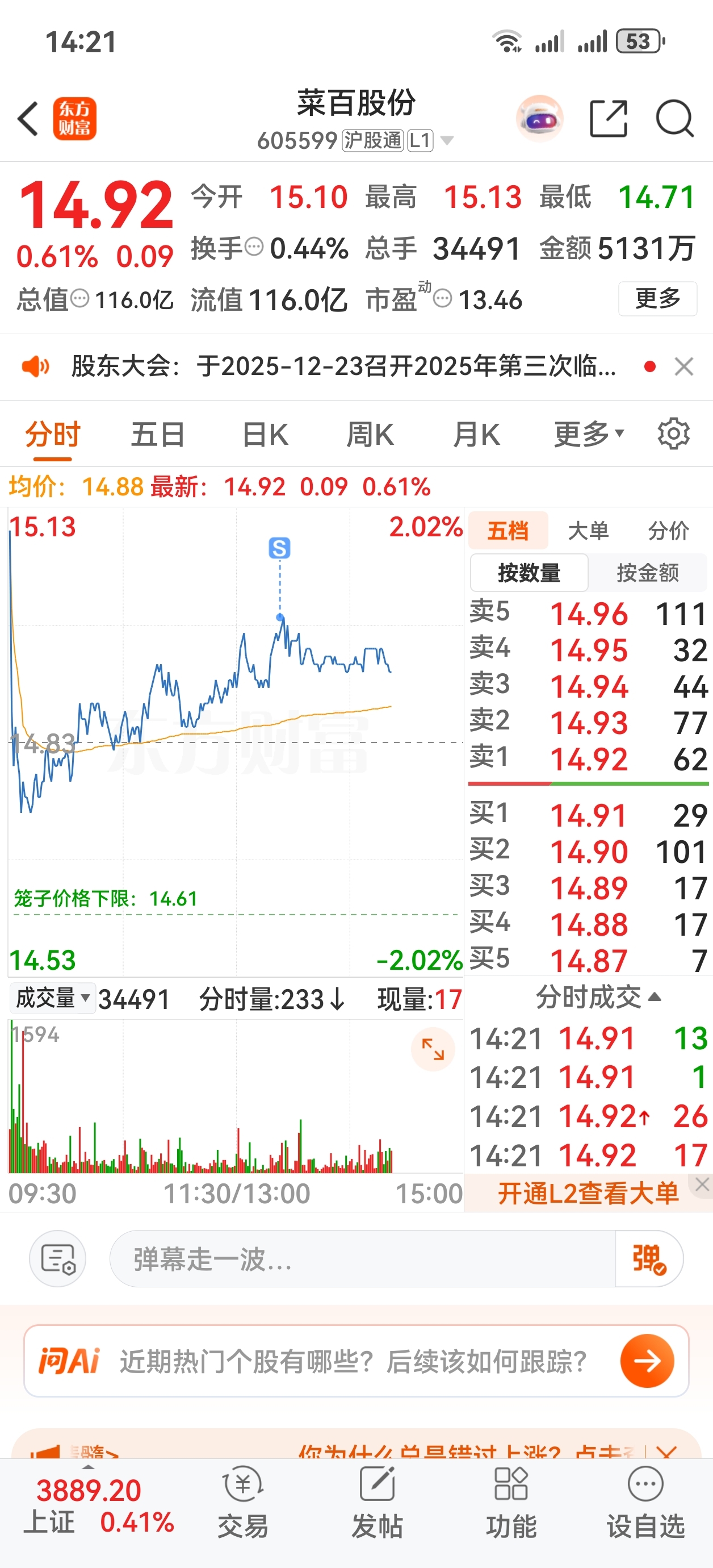 $菜百股份(SH605599)$ 跑了,还好没亏钱