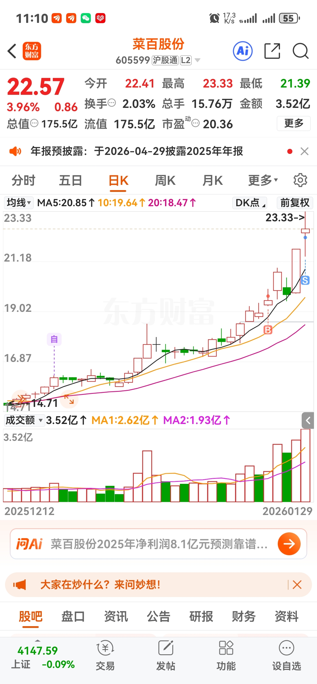 $菜百股份(SH605599)$ 减仓一半,看看后续,双手准备!#炒股日记#
