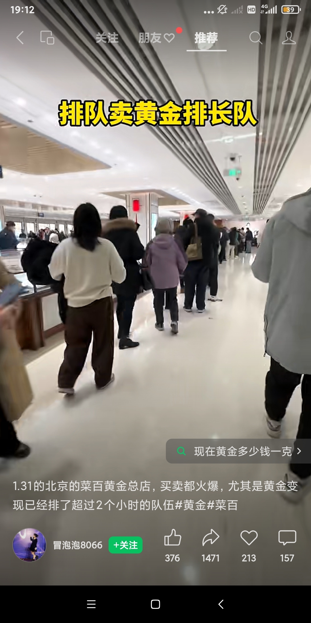 随着周五黄金白银暴跌,周六菜百市场排队卖黄金!