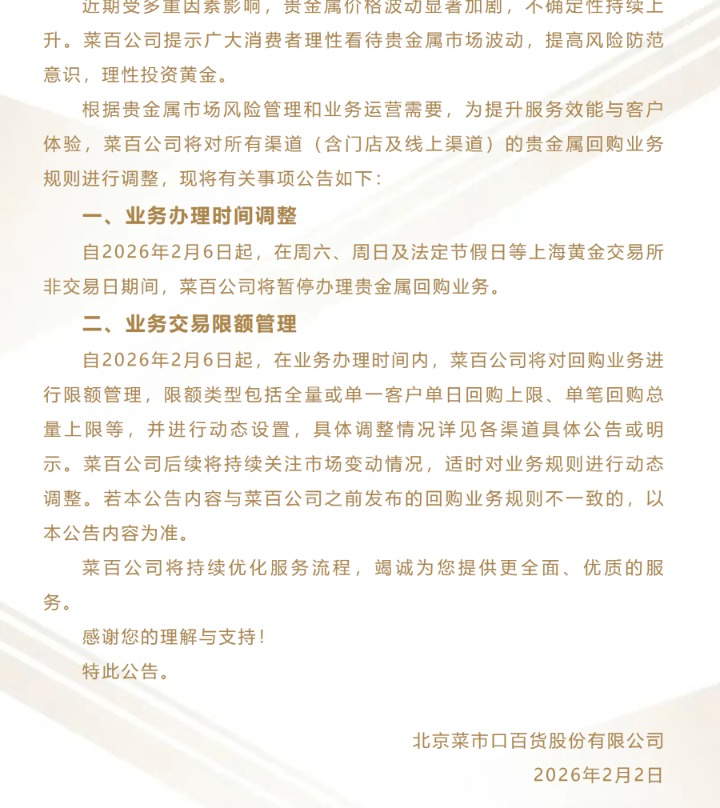 二是自2026年2月6日起,在业务办理时间内,菜百公司将对回购业务进行限额管理,限额类型包括全量或单一客户单日回购上限、单笔回购总量上限等,并进行动态设置,具体调整情况详见各渠道具体公告或明示。菜百公司后续将持续关注市场变动情况,适时对业务规则进行动态调整。若本公告内容与菜百公司之前发布的回购业务规则不一致的,以本公告内容为准。