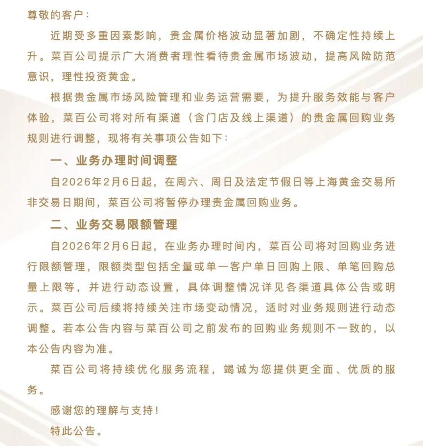 自2026年2月6日起,在业务办理时间内,菜百公司将对回购业务进行限额管理,限额类型包括全量或单一客户单日回购上限、单笔回购总量上限等,并进行动态设置,具体调整情况详见各渠道具体公告或明示。菜百公司后续将持续关注市场变动情况,对业务规则进行动态调整。