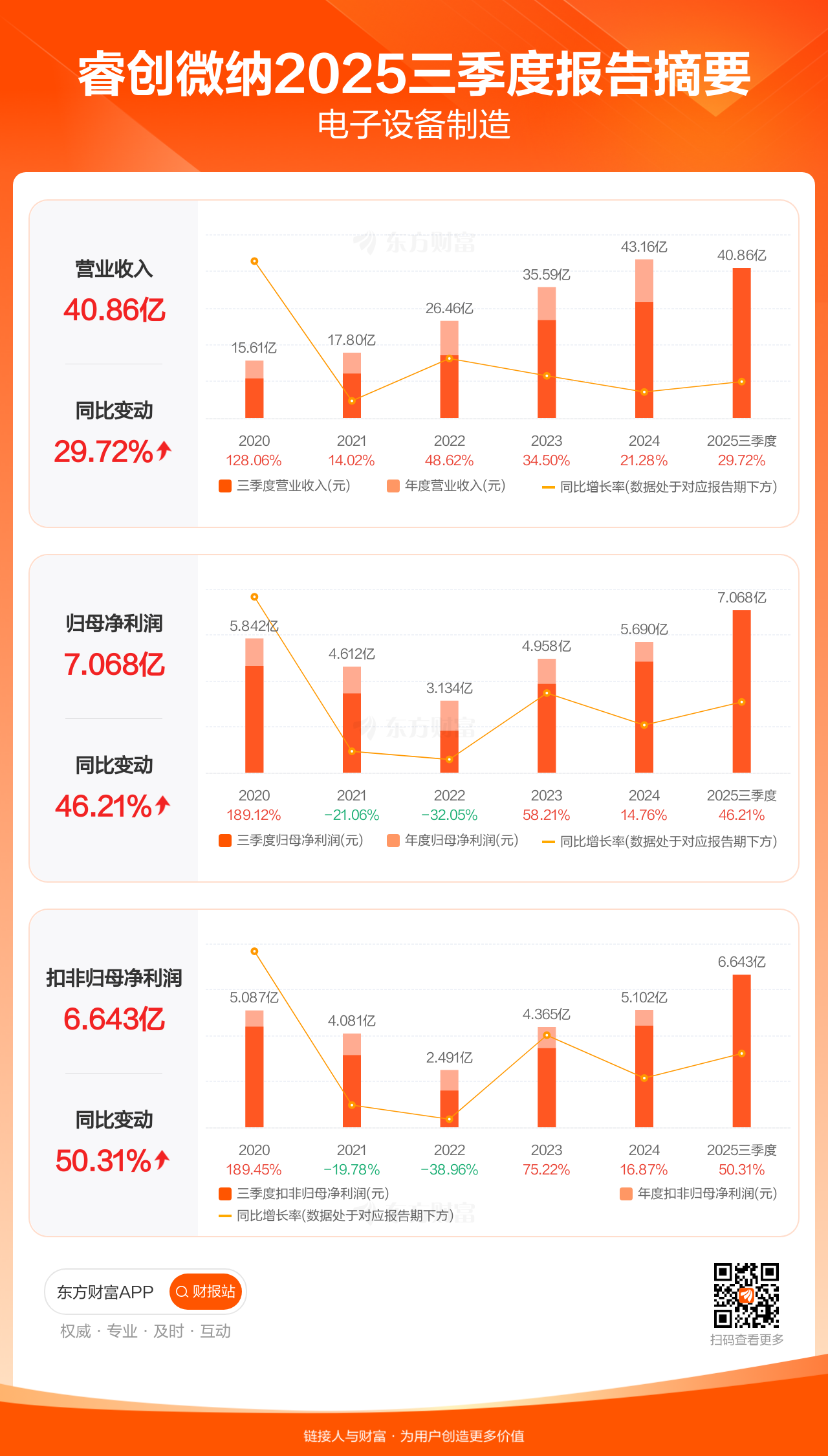 睿创微纳10月28日发布2025年三季报显示,公司前三季实现营业收入40.86亿元,同比增长29.72%;归母净利润7.07亿元,同比增长46.21%;扣非归母净利润6.64亿元,同比增长50.31%。