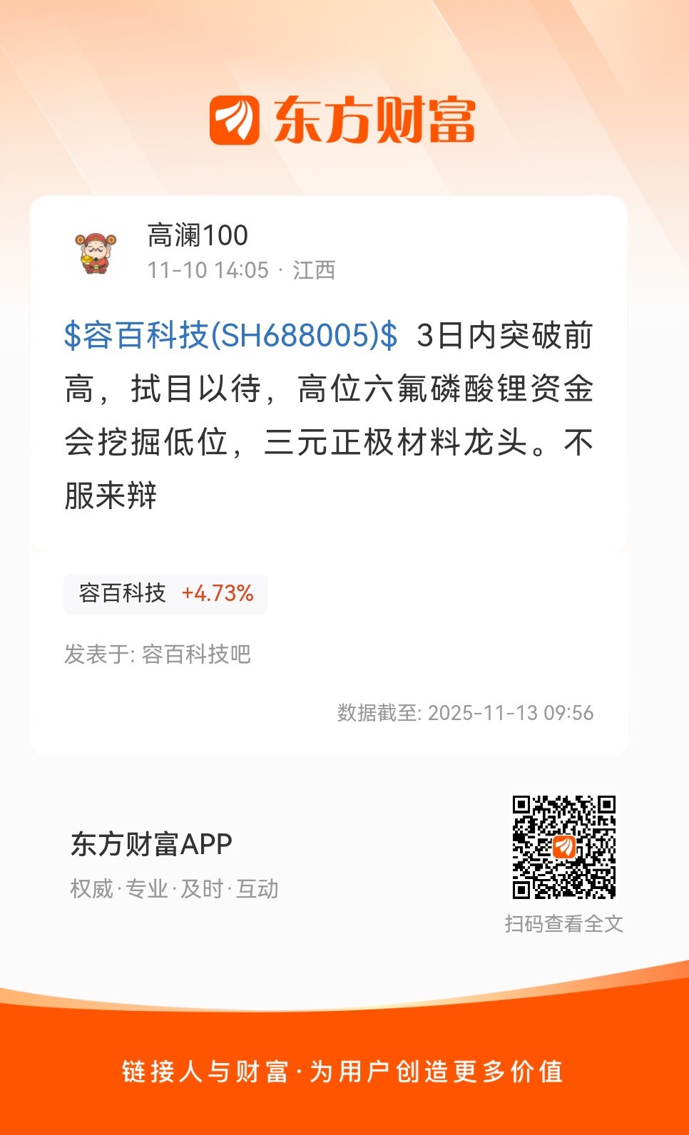 $容百科技(SH688005)$  3日内突破前高,拭目以待,高位六氟磷酸锂资金会挖掘低位,三元正极材料龙头。不服来辩