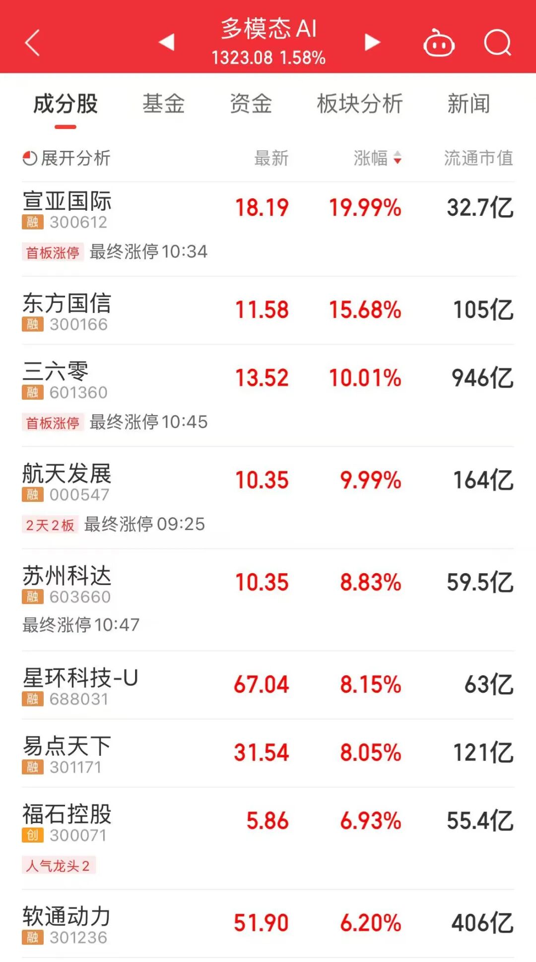 今天上午,科技股迎来反弹,AI应用全面走强,华为盘古、多模态AI、AI智能体等板块大涨。