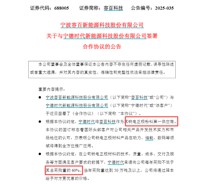值得注意的是,11月16日晚间,容百科技公告,公司于近日与新能源巨头宁德时代签署了《合作协议》。根据协议,宁德时代将容百科技锁定为其“钠电正极粉料第一供应商”,宁德时代承诺,在容百科技满足相关要求的前提下,每年采购量不低于其总采购量的60%。