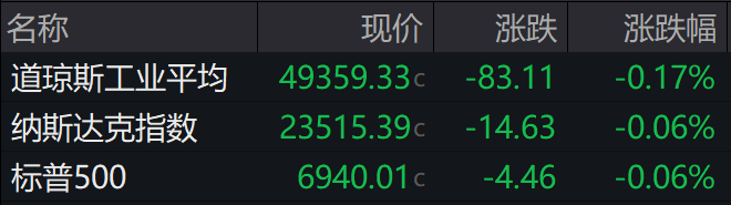 当地时间上周五,美股三大股指尾盘跳水收跌,截至收盘,道指跌0.17%,纳指跌0.06%,标普500指数跌0.06%。