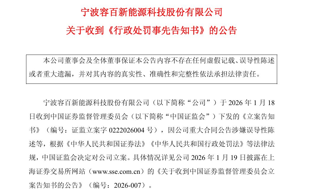 2月6日,容百科技(688005,股价30.07元,市值214.92亿元)公告,收到中国证监会宁波监管局下发的《行政处罚事先告知书》。公司因2026年1月13日发布的与宁德时代签署重大合同公告涉嫌误导性陈述,拟被中国证监会宁波监管局给予警告并处以450万元罚款。董事长白厚善及董事会秘书俞济芸拟分别被罚款300万元和200万元。