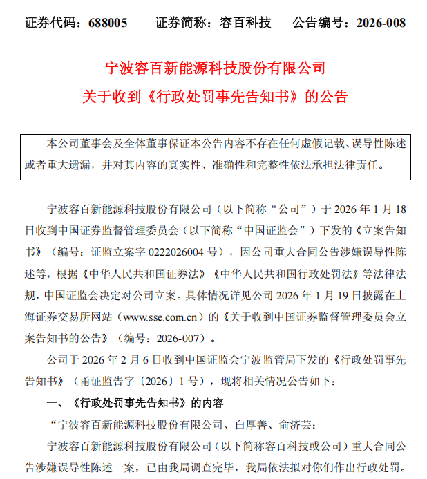 2月6日,容百科技收到宁波证监局下发的《行政处罚事先告知书》显示,容百科技1月13日晚间发布的《关于与宁德时代签署日常经营重大合同的公告》,未能真实、准确、完整地反映合作协议的实际条款内容,主要包含四点: