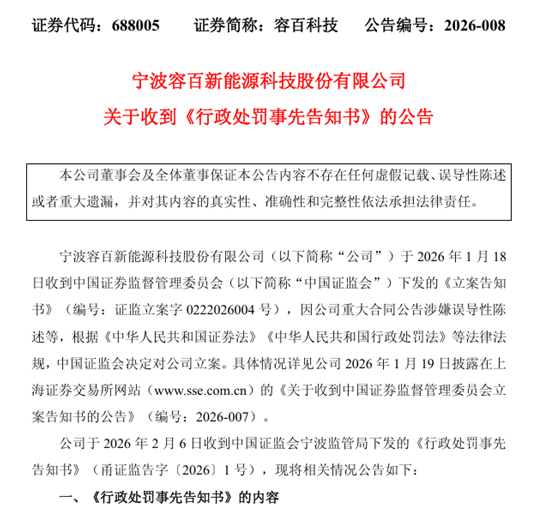 2月7日,容百科技(688005.SH)发布公告称,公司收到宁波证监局出具的行政处罚事先告知书,因此前披露的与宁德时代重大合同相关公告存在误导性陈述,公司及相关负责人合计被罚款950万元。