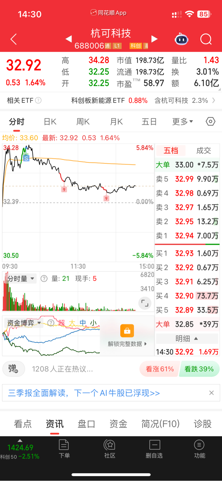 $杭可科技(SH688006)$ 上不去就跑,下来又接,跟你表演了。