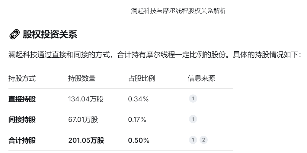 澜王持有摩尔线程一定比例的股份,润起科技通过投资“北京启创科信创业投资基金合伙企
