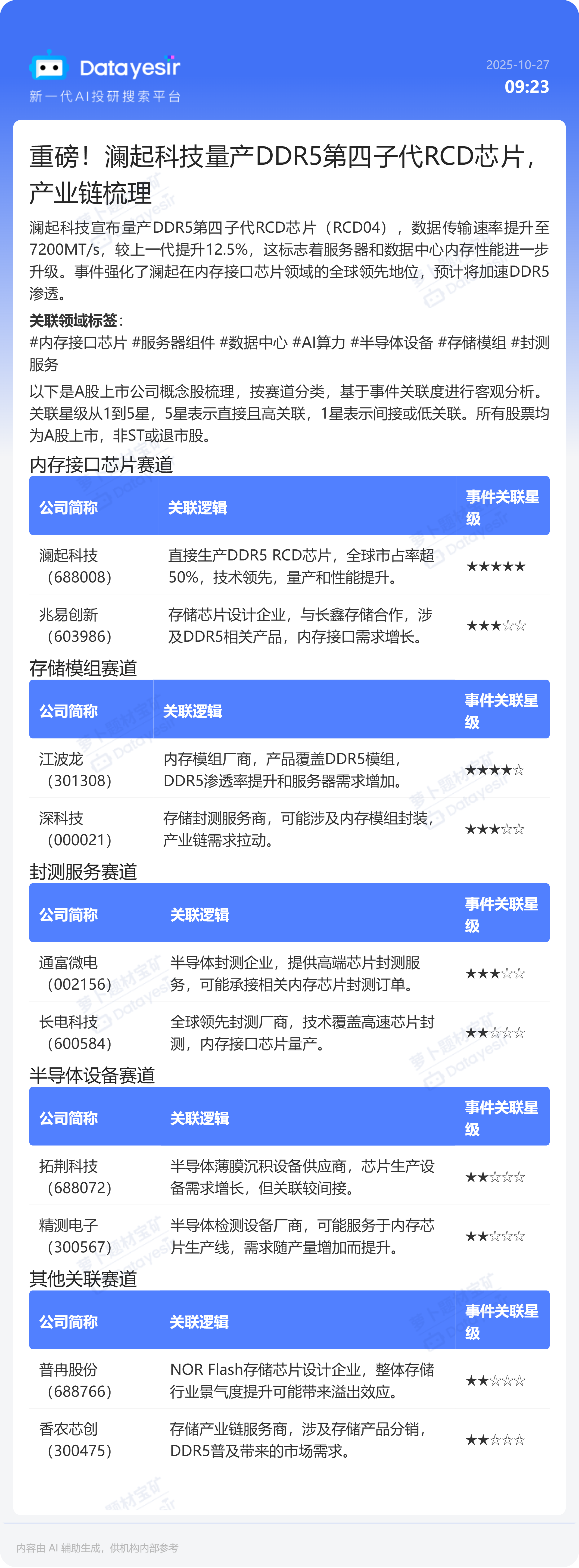 澜起科技宣布量产DDR5第四子代RCD芯片(RCD04),数据传输速率提升至7200MT/s,较上一代提升12.5%,这标志着服务器和数据中心内存性能进一步升级。
