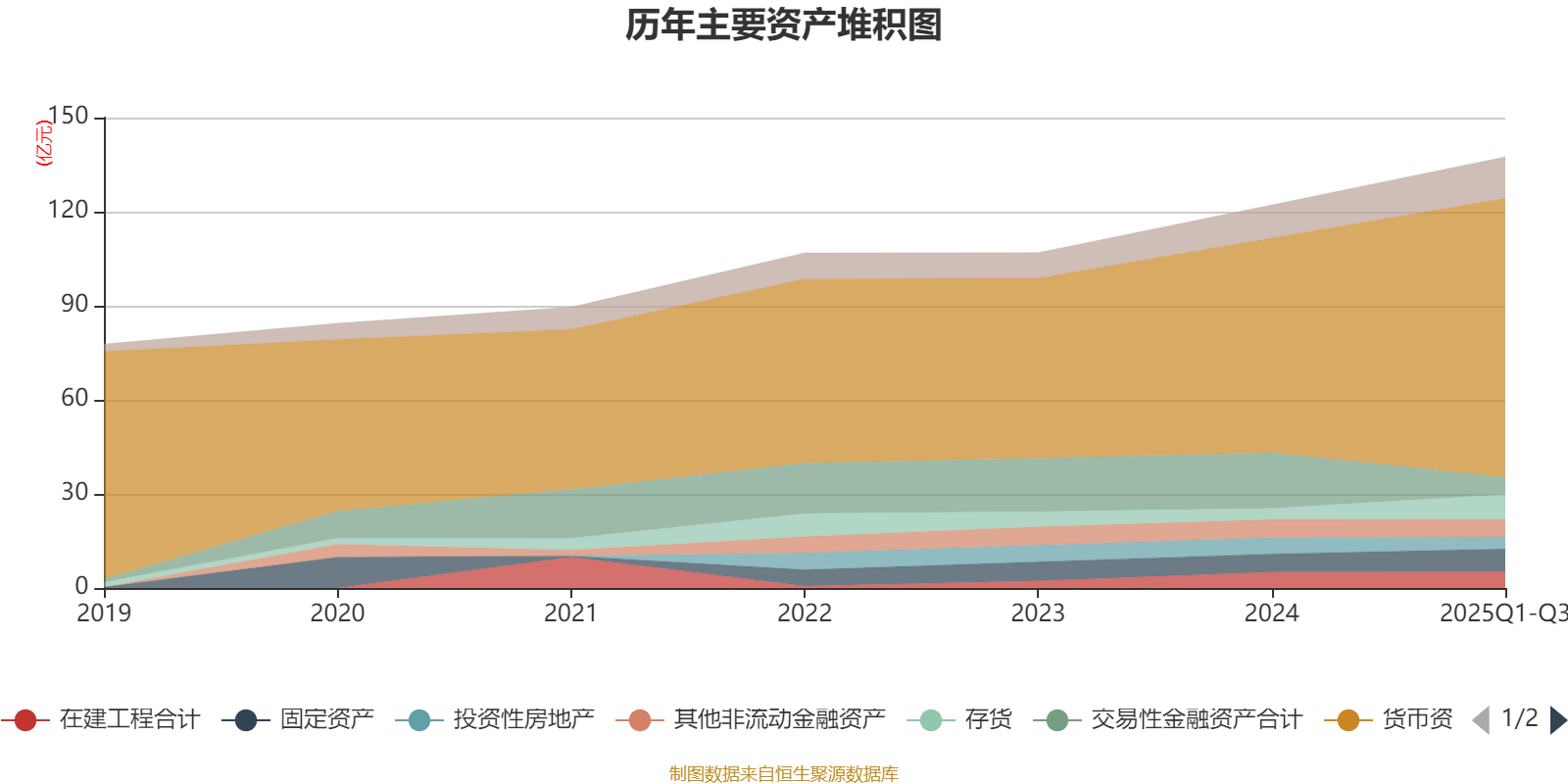 资产重大变化方面,截至2025年三季度末,公司交易性金融资产合计较上年末减少69.39%,占公司总资产比重下降10.63个百分点;货币资金较上年末增加30.04%,占公司总资产比重上升8.7个百分点;存货较上年末增加125.94%,占公司总资产比重上升2.9个百分点;投资性房地产较上年末减少26.84%,占公司总资产比重下降1.49个百分点。