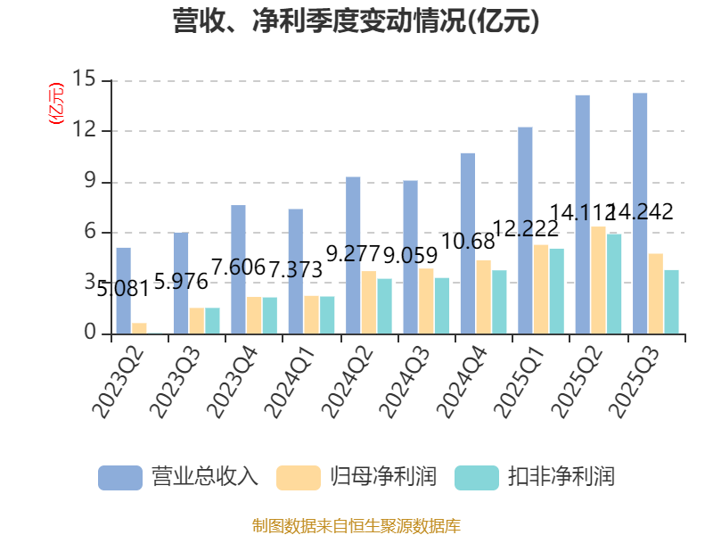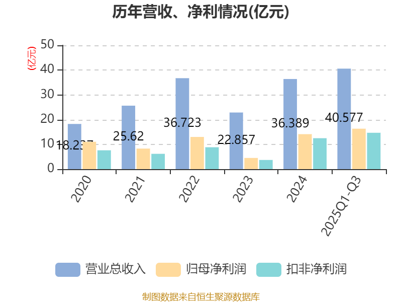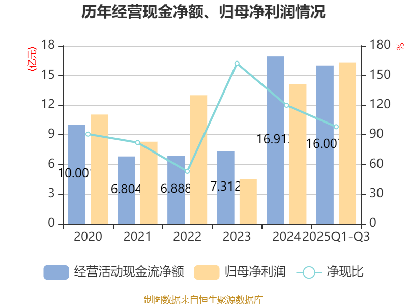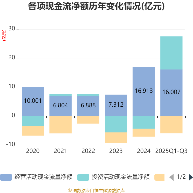 2025年前三季度,公司经营活动现金流净额为16.01亿元,同比增长26.97%;筹资活动现金流净额-6.07亿元,同比增加3725.43万元;投资活动现金流净额11.41亿元,上年同期为-1.05亿元。