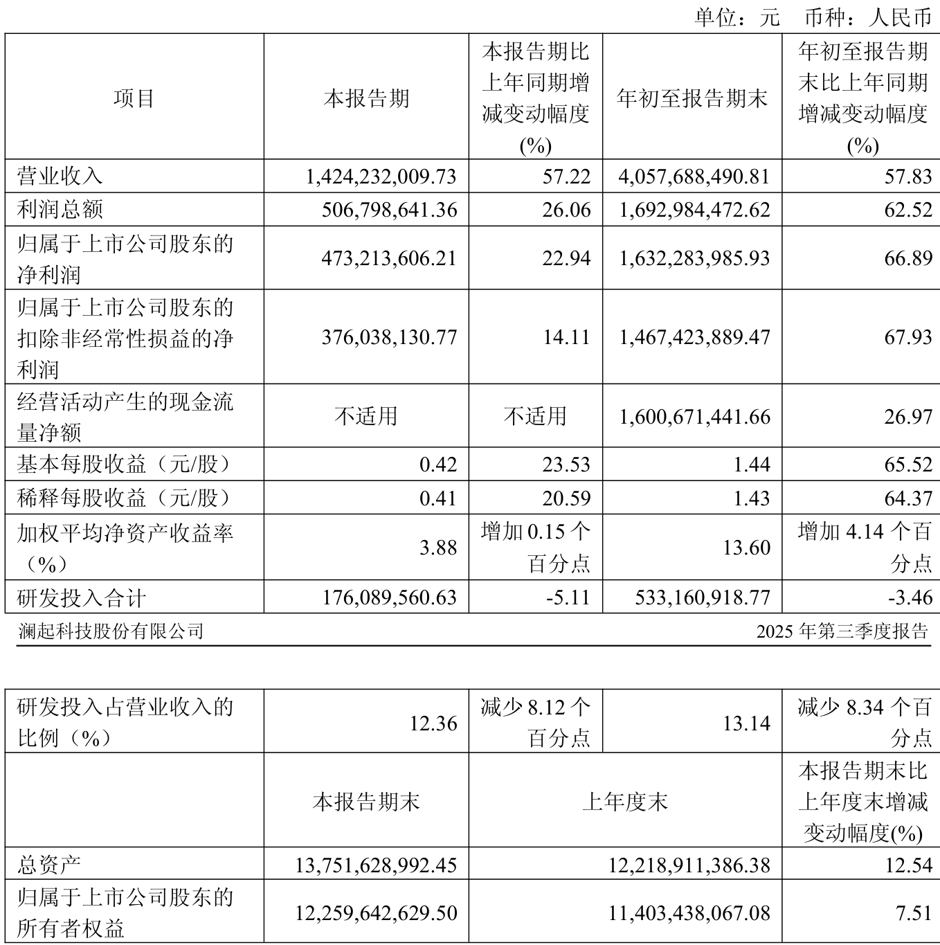 中证智能财讯澜起科技(688008)10月31日披露2025年第三季度报告。前三季度公司实现营业总收入40.58亿元,同比增长57.83%;归母净利润16.32亿元,同比增长66.89%;扣非净利润14.67亿元,同比增长67.93%;经营活动产生的现金流量净额为16.01亿元,同比增长26.97%;报告期内,澜起科技基本每股收益为1.44元,加权平均净资产收益率为13.60%。