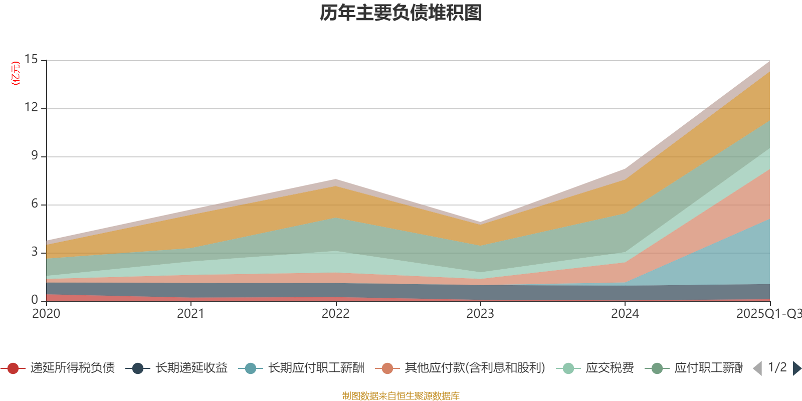 负债重大变化方面,截至2025年三季度末,公司长期应付职工薪酬较上年末增加1976.37%,占公司总资产比重上升2.8个百分点;其他应付款(含利息和股利)较上年末增加147.21%,占公司总资产比重上升1.23个百分点;应付职工薪酬较上年末减少28.41%,占公司总资产比重下降0.72个百分点;应付票据及应付账款较上年末增加44.43%,占公司总资产比重上升0.49个百分点。
