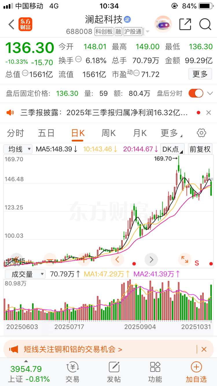 $澜起科技(SH688008)$ 朋友们,澜起科技反抽之后的破位,后期不容乐观,注意风控哦。不创新高不跟进,切记!