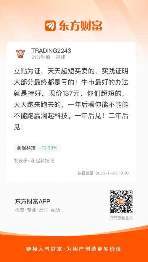 立贴为证,天天超短买卖的,实践证明大部分最终都是亏的!牛市最好的办法就是持好。现价137元,你们超短的,天天跑来跑去的,一年后看你能不能能不能跑赢澜起科技。一年后见!二年后见!